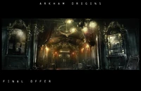 Taking Deathstroke's Remote Claw, Batman is able to learn from the Penguin, before he escapes into his safe room, of a double murder in one of Black Mask's safe houses at Lacey Towers. On his way out of The Final Offer, Batman receives a broadcast from the controversial vigilante appropriately named Anarky which he interprets as more bad news on top of the rest of the madness of the night.