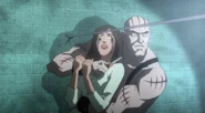 The remaining Suicide Squad members frantically and separately try to escape the island, but only Deadshot is successful, while Captain Boomerang is recaptured and Killer Frost is (possibly) killed by Bane. Deadshot travels to Gotham City by stolen helicopter, but discovers the Joker and Harley Quinn were stowing away with him. Batman arrives on the scene and Deadshot battles the Joker as Batman subdues Harley Quinn. Batman defeats Harley Quinn and defuses the bomb hidden in her mallet, thus saving the city. A heavily-wounded Deadshot is likewise able to defeat the Joker, though the villain escapes through a fall. The epilogue shows Deadshot, a free man and reunited with his daughter, about to snipe Amanda Waller in retribution for forcing him into the Suicide Squad; the scene ends before he pulls the trigger.