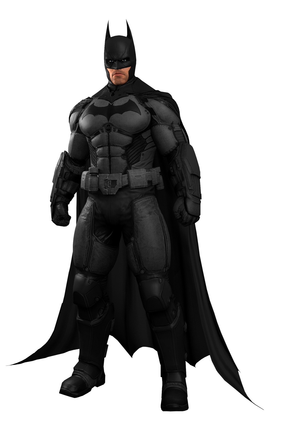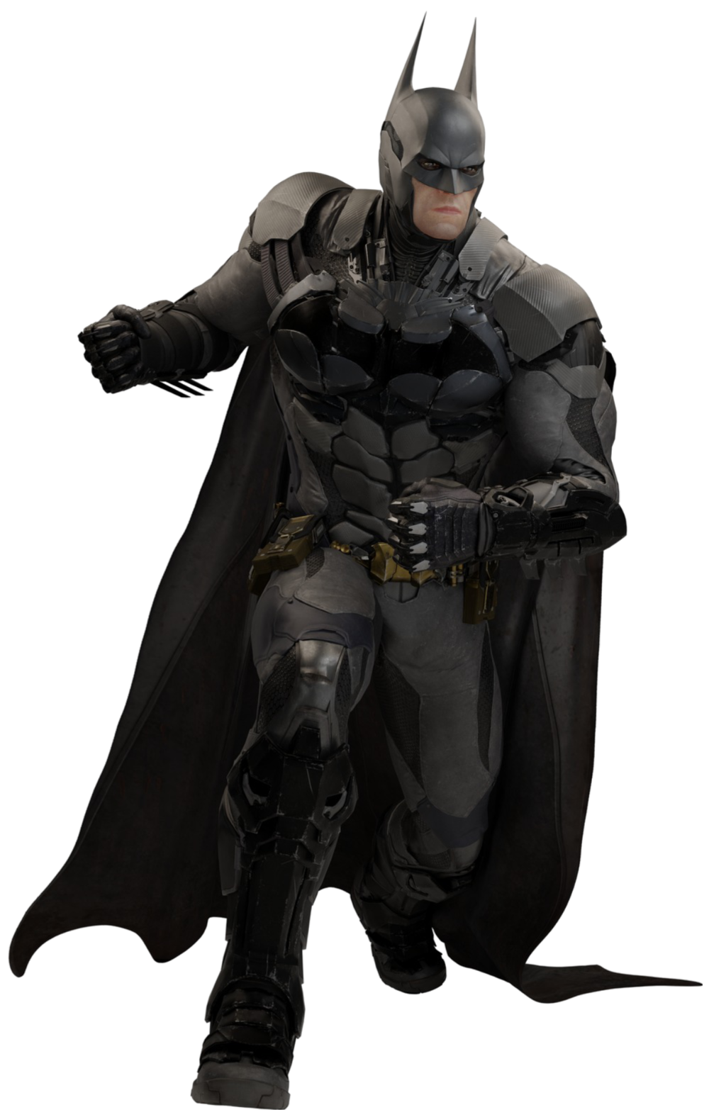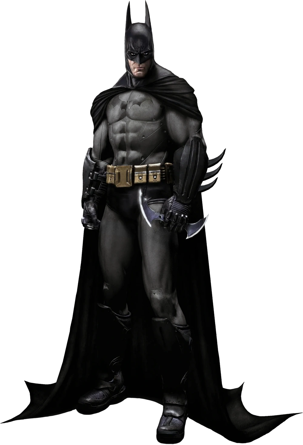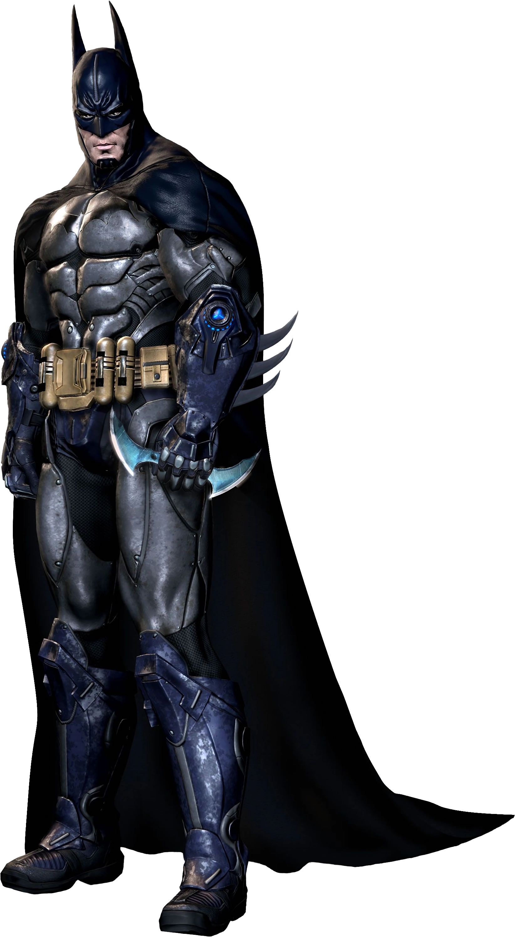 The cape was a memory cloth that was developed by Wayne Enterprises that had been shelved and never utilized. At first glance, it looked like a simple, flexible fabric like Nylon on the outer layer, similar to a parachute, but when a current was applied, the loose molecules realigned and became rigid, which allowed him to glide over long distances, Additionally the material was water and fireproof and the winged tips could be used to disorient foes in combat. The cape also had a secondary feature that allowed Batman to hide where his body actually was when he dealt with snipers, as seen with Deadshot at Blackgate Prison in Batman: Arkham Origins Blackgate. The gloves consisted of black ballistic combat gloves that had reinforced knuckles and were made out of brass and Kevlar, which also contained 3 custom made bladed fins in the gauntlets, that were used to block knives and other slashing weapons.