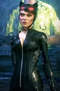 Catwoman's apparel is about the same as in Arkham City. However there are some differences. The cat pendant on her choker is gone but there is now a different cat pin on her cat suit. The collar on her suit is now much smaller and she has a holster for her whip near her waist. Her appearance is also different. Her hair is considerably longer and it is now a lighter shade of brown. Her eyes are much tighter and there are scars on her left cheek and right eyebrow following the explosion of her home in Arkham City. Additionally her face is covered in numerous open cuts and bruises from her many battles with Riddler's robots in the orphanage.
