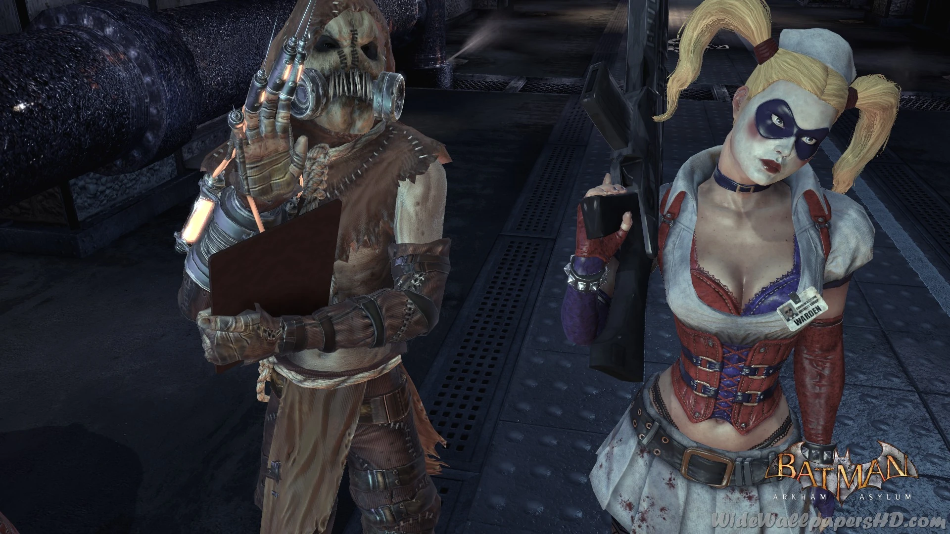 Harley used a gray metal bat to fight the Arkham Asylum security guards, later replacing it with Joker's mallet.